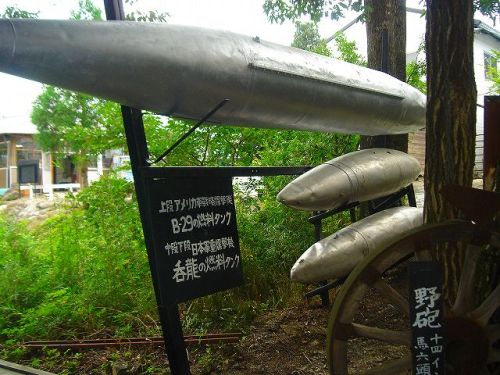 これはなんともいえん。上がB-29、下が呑龍重爆の燃料タンク。B-29が落下増槽をつけて日本爆撃に来たのは事実です。昔、雑誌でB-29が落とした増槽という写真を見たことがあります。しかし、これがそうかね。呑龍が増槽をつけていたというのも初めて聞いた。両先細りの流線型は当時の日本的ではない。戦後のジェット戦闘機がつけていそうな形状だ。結局よく分からん。増槽であることは間違いないでしょう。B-29のだとして何でここにあるんだろ。呑龍のはどうもね。