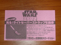 7月9日から上映される「スター・ウォーズ エピソード3/シスの復讐」の前売り券を購入しました。前売り券購入の目的は、先着50,000個限の“光る!ライトセーバーストラップ(限定品)”が欲しかったからです。このシリーズは、毎回観に行っているので値段が安くなって限定のストラップまで貰えるということでかなり得した気分です(o^0^)oトップページ●アクセスアップのための人気blogランキング●