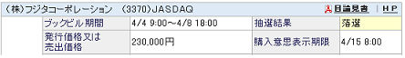 (株)フジタコーポレーション (3370)JASDAQ を申し込みました。結果は、4/11 18:00以降になります。他にも2銘柄申し込むチャンスが有ったのに金欠病です(>_<)どうか当りますように(-人-)トップページ●アクセスアップのための人気blogランキング●