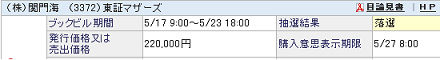 (株)関門海 (3372)東証マザーズ を申し込みました。結果は、5/24 18:00以降になります。前回のような失態をしないように資金は調達済です(o^-^o)売出価格は、220000円と安目です!どうか当りますように(-人-)●アクセスアップのための人気blogランキング●←(^人^)ヨロシク