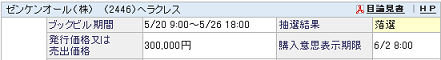 ゼンケンオール(株) (2446)ヘラクレス (株)NowLoading (2447)セントレックス の2銘柄を申し込みました。結果は、5/27 18:00以降になります。売出価格は、2銘柄とも300000円です!どうか当りますように(-人-)しかし、最近の持ち株の下落の大きさに立ち直れませんo(>< )o o( >
