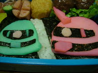 以前に、兄ちゃんのリクエストに負け、1度だけと作ってしまったザク弁当兄ちゃんに作ったら同じようにしないといけないと、弟くんにも同じ物を作り…これで平等問題なしそう思ってたのに…今日、兄ちゃんたちは音楽会のため給食が食べられないだから必然的にお弁当がいる役目は果たしたから何にも考えてなかったのに満面の笑みで兄ちゃんは囁いた「今度はシャアザクね」・・・・・・・・・・・・・・・・・・・・・・・・・・・・・・・・・頑張って抵抗はしたもののこんな時にだけは綺麗な澄み切ったで見つめてくるんだよなぁご想像の通り負けました完敗です今日のお弁当見て下さい この際やけくそでふたつですおかずは簡単な物ばっかりで、ぜ~んぜん時間かからないけどザクを作製するのに時間がかかって焦りましたぁついでに、弟くんに文句言われない様にと同じ物を作って一度で済ます予定だったのに…「次はねぇ…」と違う方向へ喜んでくれるのは嬉しいけど、あたし墓穴掘っちゃったかな