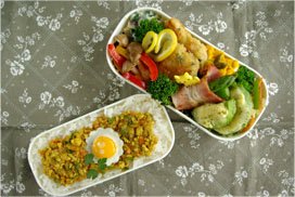 関東地方、今日は朝から青空。明日まで梅雨の中休みのようです。気合を入れて洗濯・掃除に燃えました~。おまけにパンも焼いたし、もうヘロヘロです。晩ごはん作る気力がないので、お刺身買ってきちゃいました。(笑)今日はカレーチャーハン。おかずのメインはチキンです。カボチャもメインになるかな?大きな画像とおかずの詳細はこちらからー。「お弁当×さんぽねこ」右肩はもう一息ってかんじで(まだ後ろに手が回らないけど)ゴシゴシ磨きも(時々休めば)しっかりできるようになりました。でも右手が使えない間、がんばった左手がずいぶん器用になった気がします!利き腕ばかりに頼っちゃだめね。夫婦の関係もおんなじ?では皆さん、楽しい週末を