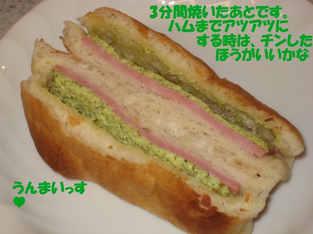 オリーブオイルを練り込んだパンに、厚ぎりハムとバジルチーズクリームをはさみました。