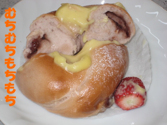 苺味のベーグル生地で甘いおもち(求肥)とあんこを包み 込み、カスタードと苺をトッピング♪