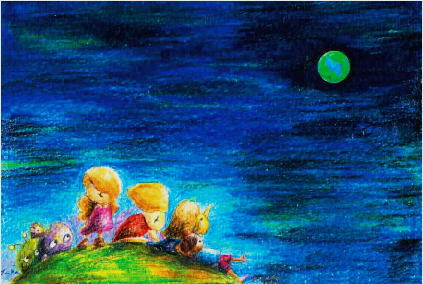 このブログ「今日のフォーカスチェンジ」を、 メルマガでも読むことができます。クリックすると、登録画面に飛びます。 -----------------------------------------------------ティードリ 子どもたちが、自分らしい表現方法で、自分の夢を発表するイベントです。いよいよあさってにせまりました!今回、ちらしや当日パンフレットのイラストは、「伴」ちゃんというすてきなかたが、描いてくださっています。今日は、そのイラストのイメージをもとに、発信してみたいと思います。今日は、このイラストから♪★今日のフォーカスチェンジ♪祝福の光「ねえねえ、今度はどこにする?」「ここがいいよ。 だって、とってもきれいだから!」「きれいだからといって、 すみやすいとはかぎらないよ」「どんなすみかたをするかは、 私たち次第よ。 きっといい時間になるわ」そんな話をしているのは、カタリベたちでした。カタリベたちは、宇宙をずっとずっと旅しているのでした。そして、ときどき、気に入った星におりては、そこに住み、また、ときがきたら旅立つ。そんな暮らしをしているのです。カタリベたちの仕事は、宇宙を旅しながら、宇宙のさまざまなできごとや、星で起きていることを、たくさんのひとに伝えること。だって、宇宙は広いから、誰もが、好きなところに行けるとはかぎりません。宇宙を旅するには、とてつもなく精密なキカイがなければできないと思っているひとびとも多いのです。それどころか、宇宙には、自分たち以外の生命体はいないと思っているひとびともたくさんいるのです。カタリベたちは、そんなひとたちにも、宇宙で起きているさまざまなことを伝えるために、旅をしているのです。そのために、その星のひとたちと同じような姿になって、その星のひとたちと同じように暮らします。カタリベたちが、降り立とうとしているのは、チキュウと呼ばれている星でした。「これだけきれいな星は、 そうそうあるもんじゃない。 きっと、こころのきれいな ひとびとが住んでいるよ」「そうだね。楽しみだね」カタリベたちは、そうして、チキュウと呼ばれる星に降りていきました。チキュウを体験するために。チキュウを感じるために。それから、数千年という時間が流れました。もっともこれは、チキュウで考えられている、時間の概念にあわせたもので、宇宙の時間の解釈はちょっとちがいますけれど。ともかく、それだけの時間が流れたあとに、カタリベたちは、また、旅に出る時期がきていることに、気がつきました。それぞれの場で、それぞれの役割を終えて、また旅立つのです。「楽しかったね」「ああ、楽しかったね」カタリベたちは、ひさびさの再会をよろこびあいました。何千年なんて、ほんのちょっとの時間ですけれども、やっぱり仲間と離れているのは、ちょっぴりさびしいものです。「いろいろなことがあったね」「そうだね。 この短い時間のなかで、 ニンゲンたちが、どんどん、 変化していくことが、 一番おもしろかったなあ」そんな話をしているものもいます。「でも、ちょっと心配だな。 ニンゲンたちは、あまりにも 宇宙の仕組み、いのちの仕組み のことが、わかっていない」「そうだよ。このままでは、 自分たちで、自分自身を ほろぼしてしまうかもしれない」そんなことを語り合っているものたちもいます。「さあさあ、旅立ちの時間よ。 ニンゲンたちのことは、 ニンゲンたちにまかせなさい。 私たちは、ただ語りつぐだけ」リーダーのカタリベが言いました。別れのときが、やってきたのです。カタリベたちは、手をつなぎ、チキュウのうえで、まあるく輪になりました。「ありがとう、チキュウ」「また合う時は、チキュウ時間で、 数億年先になるかな」「私たちは、忘れないわ。 あなたたちという、いのちの かたちがあったこと」「語り継いでいくよ。 この美しいチキュウのことを」「祝福の光を注ぎます。 これは私たちからの贈りもの」輪のなかが、光で満たされ、光は、まばゆくきらめきながら、地上へと降りていきました。その日、チキュウでは、「今夜のオーロラは、 過去に例を見ないほど、 美しいもようを見せています」と報道されました。誰も、一人ひとりの胸に落ちてきた、光のかけらに気づきませんでした。光は、チキュウを包み、すべてのひとを、そして、すべての生きものを包んだのです。いいえ、ただ、世界じゅうの赤ちゃんだけが、そのことに気づいたかもしれません。その夜、赤ちゃんたちは、とてもごきげんに笑って、すやすやと眠りについたのです。だって、光は、あまりにもここちよく、こころとからだを満たしてくれましたからね。いまごろ、カタリベたちは、どこを旅しているのでしょうか。その先々で、チキュウのことを、どんなふうに語り継いでいるのでしょうか。どうぞ、今度、天気のいい夜に、外に出て、星空をながめてみてごらんなさい。姿は見えなくても、そこには、きっとカタリベたちがいる