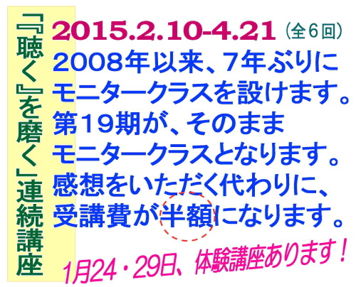 「『聴く』を磨く」連続講座(全6回)について「『聴く』を磨く」連続講座(全6回)この1月13日にスタートしているはずでした。実は、まだ、スタートできていません。理由は、再受講の希望はあったのですが、新規の参加者さんがいなかったのです。2008年のモニタークラスから、直前の第18期まで、これまで、人数の増減はありましたが、新規のお申し込みゼロは、はじめてでした。それで、第1回目開催予定だった、1月13日に、急きょ、卒業生グループ「聴くワザTOKYO」のみなさんに呼びかけて、集まってもらいました。「『聴く』を磨く」を体験していただいた、みなさんの意見を、聴きたかったからです。その場に参加できないひとも、メーリングリストや、フェイスブックページ、あるいは個人メールで、感想や意見、応援メッセージを寄せてくれました。本当にありがたかったです。そして、集まったメンバーには、じっくりと、話を聴いてもらいました。ふだんは、講師やファシリテーターの立場の私が、これだけ、しっかりと話を聴いてもらえるのは、本当に、久しぶりだったかもしれません。尊重。信頼。受容…。そこには、そんな空気が満ちていました。卒業後も、みなさんが、それぞれに「聴く」を深めていることが感じられました。それから、さまざまな意見を、聴かせてもらいました。客観的な意見が聴けて、本当に貴重な時間でした。告知不足という意見もいただきました。また、18期(前回)から、講座の内容を、よりサポーティブなものにし、それにあわせて料金改訂もしたのですが、その改訂の内容が伝わっていないという、あたたかくも、きびしい意見もいただきました。どれも、一つひとつ、うなずけることばかり。せっかく、卒業生のみなさんが積みあげてきてくれた、「『聴く』を磨く」の歴史を、私の対応不足、考え不足から、今回、中断させてしまったのだなあ、とも感じました。 もちろん、卒業生のみなさんが、そのように 言ったわけではなく、私が勝手に感じたのです。そして、ひとりのメンバーが言ってくれたことばが、強く、こころに残りました。「19(期)って、1ですよね。 1って、スタートってことですよね」数字をあつかう占いなどで、それぞれの桁を足していく計算式があります。2015なら、2+0+1+5という感じです。「『聴く』を磨く」19期の、19も、1+9=10。1+0=1、ということになります。そうか。もう一度、初心にもどって、考え直せばいいんだ…。そんなふうに想えました。それから、毎日、いろいろ考えました。このチャンスをどのように活かそうかと。まず、第19期のスタートを延期することにしました。1か月遅らせて、2月10日開始とします。そして、それまでに、体験講座をひらきます。急ですが、1月24日(土)夜・横浜と、1月29日(金)夜・東京で、設定しました。詳細は後述します。また、連続講座の形態を、いったん、第17期までのスタイルにもどします。ただ、追加した「個人セッション」は、実際に体験していただいたかたからは、うれしいことに、好評をいただいています。実際、再受講を申し込んでくれたかたは、先に予約を入れてくれたほどです。ですので、これは、オプションとして、活かしていきたいと想います。希望するかたに、個別に申し込んでいただくかたちです。また、18期を経て、講座の内容も、けっこう様変わり(進化!)してきています。「『聴く』を磨く」講座を開催する前には、参加者の感想を知るために、モニタークラスを開設したのですが、今回、19期を、あらためて、モニタークラスにしてみたいと想います。もう一度、初心に返って、参加者のみなさんの感想を真摯に聴き、20期に向けて、しっかりと講座を構築し直していきたいと想います。というわけで、第19期。モニタークラスですので、感想はしっかりいただきますが、参加費は、従来の半額にさせていただきます。(30000円→15000円)この価格は、二度はありません受講を迷っていたかた、チャンスかもですお申し込みの詳細は、このメルマガの後半をお読みください。「『聴く』を磨く」体験講座第1回目日時/2015年1月24日(土)18時~20時会場/横浜市内施設(横浜駅より約10分)第2回目日時/2015年1月29日(木)19時15分~21時15分会場/東京都内施設(五反田駅より約10分)参加費/2000円(当日お支払いください)お申し込み/こちら!問い合わせ/こちら!*-*-*-*-*-*-*-*-*-*-*-*-*-*-*-*-*-* ★「聴きかた」は「生きかた」★ 連続講座「『聴く』を磨く」第19期(全6回)*-*-*-*-*-*-*-*-*-*-*-*-*-*-*-*-*-*日時/2015年2月10日・24日、3月10日・ 24日、4月7日・21日。(いずれも火曜日) 19時30分~21時30分フォローアップ会/5月12日(火)19時~21時会場/渋谷区内施設、ほか(後日お知らせします)参加費/15000円(全6回・モニター価格)お申し込み/こちら!問い合わせ/こちら!--------------------------------------------聴きかたが変わると、生きかたが変わります。生きかたが変わると、人間関係が変わります。人間関係が変わると、人生そのものが変わります。こころで