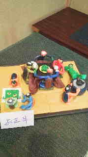 このかっぱ達は、新聞を少しずつ裂いてこよりの形をつくり