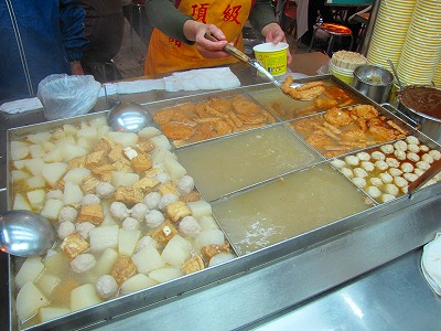おでん、台湾では、結構、庶民的で、良く食されている。セブンイレブンの店頭では、おでんの事を関東煮と表示している。台湾の屋台では、おでんの発音に近い漢字を黒輪(福建語、台湾語)と表示している。また、練り製品が入っていることで、天婦羅の漢字で表示する。テンプラの発音に似せる漢字を甜不辣(北京語)と表示している。さて、その正体は、なんだろう?萬華の超繁盛店へ伺った。雨の夜にも拘らず、凄い長列で、人が並んでいる。黄色の目立つ看板で、萬華夜市でも、有名店だ。味は、日本のおでんと味が変らない。ベースは、澄んだ豚骨スープに、鰹出汁、味の素、塩に、少しの醤油味から構成されている。サッパリした味に、ホッカホッカのスープは、寒い日には、最高だ!台湾もこれから、冬に入る。日本で言うと、秋ぐらいの涼しい気候は、過しやすい。鍋料理、スープ料理、おでん、焼肉などが、美味しくなる。
