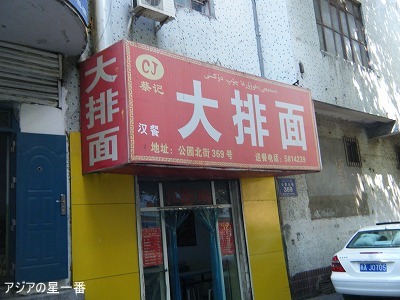 7月27日(水) シルクロードの旅 27日目本日は、ウルムチのホテルに缶詰で、ゆったりしております。と言っても、写真の整理と、書けなかったブログの原稿を、朝から、ずっと書いていますので、ゆったりとは言えません。今、午後7時半。ようやく、本日の、ブログの原稿書きまで辿り着きました。日にちを置いて、ブログを書くと、どうも、いい加減になってしまうような気がします。記憶が薄れると言うか、感じたことを忘れてしまうとか・・・。書きたいことを、メモに残しておかねばなりませんね。昼食は、食べに外出しました。あんまり遠くへ出かけたくないので、ホテルから、歩いて数分の、人民公園北街にある、麺です。「大排面」「大肉」とは、豚肉のことなんですね。「排」とは、大きくて厚みのある肉を油で焼いたものを言います。「面」、とは、麺です。因みに、ステーキは、「牛排」、と書きます。従いまして、「大排面」、」とは、豚肉のステーキを乗せた麺であります。これです。どでかい豚肉が乗っております。麺は、米粉です。ですから、拉面と比べると、ちょっと柔らかな歯ざわりですね。味は、醤油っぽい味なので、蘭州拉面より、日本人には、好まれるかも知れません。これに、ゆで卵も頼みました。醤油に、調味料を加えて、煮たゆで卵なので、味付です。これで、13元。170円弱です。ネットを見ておりますが、円高ですねー! 77円台ですよ! 驚きです。ユーロも、112円台です。日本経済、そんなによろしくないと思うのですが、この為替は、おかしいですね。普通でないです。それに、中国の汽車の事故があったのですね?事故のあった車両を分解して埋めたらしいですが、信じ難い行動です。明日は、トルファンに移動です。追記 2011年8月27日(土)一時帰国し、会食が始まりました。昨日は、川崎で、以前勤めていた先輩と、食べて飲んで話して、4時間。本日は、蒲田にて、チェンマイで知り合った方と、食べて飲んで話して、2時間半。そして、明日は、上野で、立飲会。 と、連日、飲み会が続きます。