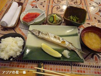ご存じ三鳥は、水木金が休みで、土日月火が、営業日です。土曜日曜のランチは、刺身定食、寿司定食のみです。月曜、火曜は、それに、焼魚定食が加わります。焼魚定食は食べた事がありません。それで、焼魚定食を食べに、火曜日に出かけました。この日は、「サヨリ」であります。サヨリは、ダツ亜目に属し、サンマとか、トビウオと同じ亜目です。ダツ亜目の中に、トビウオ科、サヨリ科、ダツ科、サンマ科があります。皆さん、親戚なのですねー。サヨリも細長く、サンマに似ています。尚、ピン川の東にある、サユリは、エロ目エロ科に属しています。(スケベーな人には、分かる文章を挿入しておきました。)え? サユリって言う、彼女がいたのか? ですと?いえ、いえ、いえません、全くいません。それは、考え過ぎです。サンマと似ていても、サヨリの味は、サンマとは違います。何故か、サヨリは、上品な感じがします。単に見た目の事を言っています。上品でしょう?サンマのように、脂ぎっていないし、サヨリの方が味も上品に思います。如何ですか? このサヨリ。ただ個人的には、サンマの方が好きなのですねー。(お笑いのさんまも好きですが、、ほんま物のサンマです。)サヨリさん、すみません。尚、この焼魚定食は、刺身定食と同じ、100バーツです。