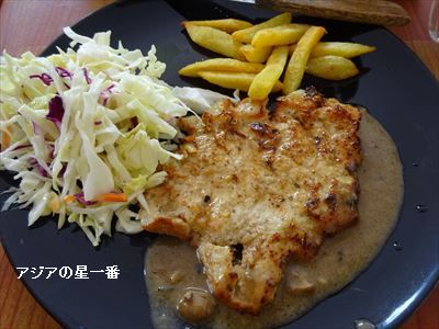 ムラキ食堂が移転してから、1年? 2年? 詳しくは忘れましたが、それから即ち、移転してから行った事がありませんでした。テニス帰りに、Mご夫妻に誘われて行きました。ポークステーキを頼みました。 美味そうでしょう? 実際、美味いのです。ここ、ムラキ食堂は、確か、ムラキさんと言う方が食べに行っていたとかでその名前が広まったとか。さらに、ワンワン食堂と言う別名もあります。その由来は忘れました。本当のお店の名前は、ムン・サバーイで、「ちゃ~お」の地図にも載っています。しかし、地図の場所が間違っているのですねー。修正されてなく、移転前の場所が記載されています。今は、運河通りから200mほど入った所にあります。以前より、洗練されたようなレストランになっています。しかし、お値段は以前と同様で、40バーツで、どのぶっかけご飯も食べられます。これは、ポークステーキ定食にして貰いました。全部で、70バーツ=240円弱です。美味しくて安い。良いですなー!日本人のお女将さんに、「仲々、美味しかったですよ。」と言ったら、Mさんに、仲々は、余分だろう、と言われました。「仲々、美味しかった。」、この言葉、おかしいですかね?辞書を調べて見ると、「予想を上回る。」、と言う意味があります。とすると、あんまり美味しいと思っていなかったけど、食べて見たら美味い。と言う意味になります。とすると、女将さんからすれば、「元々、美味いんじゃ!」、とお怒りになるかも知れない。とすると、アジアの星一番が言った言葉はよろしくない。とこうなる事になりましょうか?知らずに、「美味いなー!」、と言う意味で、「仲々」「中中」を使っていました。拙いなー。
