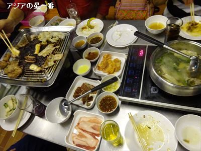 タイスキ&焼肉食べ放題、159バーツ=550円弱へ行って来ました。知り合いのお姉さん方とご一緒です。お姉さん方に、アジアの星一番は弄られながらの食事であります。焼肉と、鍋の両方が味わえて、たったの550円もしません。安いですねー!肉類、各種どっさりあります。フライとか、果物もどっさりあります。野菜やキノコ類もどっさりあります。焼いています! イカも美味しかったです。肉は、美味しいのと、それほどでもないのとあります。味がそれほどでないのも、食べちゃいますけどね。あまり拘りはありません。鍋の方は、概ね野菜を煮て食べました。お店は、満席です。隣のテーブルには、女子学生さんです。「ラパチャット大学ですか?」、と聞いたら、柔和な顔が、キッとした表情に変わり、「違います! チェンマイ大学です!」、とお答えでした。チェンマイ大学の学生さん、プライドがあるのですね。「ラパチャットと一緒にするな!」、とそんな感じでした。お店の外では、空き席を10名以上待っています。159バーツが学生さんにとって、大きいお金なのか、そうでもないのか分かりませんが、食べ放題ってところが良いのでしょうね。肉に野菜に沢山食べましたが、2時間ほど居たら、お腹が空いて来ました。食べているのに、どうしてお腹が空いたと感じるのでしょう。変な腹ですなー?穀物が入らないと、満腹にならないのかと、寿司なんぞも少し食べました。因みの、このような食べ放題のお店は、沢山ありますね。サンティタム地区と周辺に、5~6ヶ所はあるのではないでしょうか。追記当日、夜遅く、お姉さんから、お怒りのメールを頂きました。「飲物は、飲んだ人が払うものでしょう! 次回から、そうして!」、と。おっしゃる通りですねー。アジアの星一番は、飲めないか、飲める量が少ないもので、会食ではいつも、割り勘負けしています。でも、誘って頂けるだけ有難いと思い、割り勘負けの分は、仕方ないと、何の文句もありませぬ。しかし、全く飲まない人からすれば、飲んだ人の分まで、割り勘では、納得いかないでしょう。次回から、そのように致しますので、今回は、何卒、お許しの程、お願い申し上げます。(読んでないでしょうが・・・。)