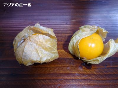 ホオズキって、食べられるのですねー! テニスの帰りに、Mご夫妻がチェンマイ大学の市場で、ホオズキを買って来られたのです。食べられると言うのです。これなのですがね。色は少し黄色いけど、確かにホオズキ(鬼灯)です。食べて見ました。始め甘く、その後少し酸っぱくて、舌に残った味は甘いのです。あれ? トマトかい? って言うような味です。ホオズキを、初めて食べましたぞ。普通、ホオズキって言ったら、赤い、このような物を想像します。これを、揉んで、揉んで、柔らかくして、小さい穴から、柔らかく、そして細かくした中身を出して、膨らませましたねー、子供の頃。そうです。誰でも、子供の頃があったのです。これが、購入したままのホオズキです。トマトは、このような袋に包まれていませんよね? ですから、トマトではありませぬ。これは、ネットで探したホオズキの写真です。同じですよ。ネットで、「食べられるホオズキ」、と入力して検索しました。そしたら、あるのですねー! 写真が小さくて分かり難いですが間違いなく、チェンマイ大学の市場で購入したものと同じです。さらに探しました。ありますねー! 苗木も売っています。食べられるホオズキがあるのです。さらにさらに、調べました。そしたら、名前が、ストロベリートマト(食用ホオズキトマト)と言うのが見つかりました。味がトマトに似ていましたが、トマトと言う文字が出て来ました。で、今度は、「ストロベリートマト」で、検索して見ました。食べたホオズキと、全く同じ写真を見つけましたぞ。このホオズキ、ストロベリートマトである事が、判明致しました。目出度し、めでたし、であります。学術的、一般的に、これが正しい名前かは分かりません。単にネットで調べただけですから。
