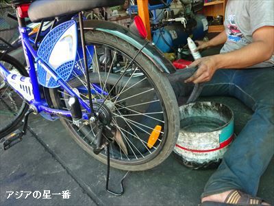 チェンマイのママチャリダー、ほっしーです。このブログでは、アジアの星一番ですが、チェンマイ仲間では、ほっしーで通っています。ほっしーさん、と呼ぶ人もいますが、「さん」は不要ですよね。ニックネームに「さん」は付けません。 ほっしー、と呼び捨てでお願いします。その話じゃーないのです。ママチャリの後輪がパンクしました。未だに名もなき、ママチャリなのです。札幌の旅友の持つ「ぶんぶん丸」に対抗して、名前を付けようとしましたが、良い案が浮かびません。色々と、持ち物には、名前を付けているのですが・・・。 例えば、* 湯沸器の: 旅がらす1号、2号、3号、4号* バックパックの: ソナイちゃん(サムソナイト)* *瞬間湯沸かし棒の: 瞬棒くんそれぞれ、良い名前でしょう?その話じゃーないのです。ママチャリの後輪がパンクしました。パンクすると面倒ですよ。買った自転車屋は、旧市街からさらにエアーポートの方向まで行かねばなりませぬ。チャリで走っても10分以上。歩いたら、35分はかかるでしょう。パンクしたチャリに乗れません。押して歩いても、チューブが傷つくかも知れません。35分も後輪を持ち上げて歩けません。どうしよう? 困った、困った、と困りましたな。しかし、そこで、はたと気が付きました。バイク屋があるじゃーないか。チャリよりでかいけど、あれもタイヤが付いている。パンクは直せるじゃろ。行って見ました。OKです。宿から歩いて1分です。早速、チェック開始。チェックを始めたので、その間に昼飯を食べに行きました。近くの現地食堂です。豚肉が乗ったシンプルな食事です。30バーツ=100円位。このママチャリ、一昨年の11月に買いました。2,800バーツです。何と、ケチなアジアの星一番が、1万円近くも出して買った貴重なママチャリ。それでも、最安値のママチャリだったのです。それから、正味6ヶ月は乗ったでしょうか? スタンドが壊れてしまい無料で取り換えて貰いましたが、それ以外、故障なく走って来ました。バイク屋、帰ったら、他のバイクを直しています。さすがタイ人。気が利く仕事はしません。アジアの星一番が帰ると、ニコッと笑って、ママチャリ号を始めました。え? ママチャリ号? そんな名前にしたの? 平凡やなー。ママチャリン号、の方が良いかい? ほんとんど同じじゃ。チェンマイ号、何だかタイ第2の都市を乗っ取った感じだ。ノッパカオ号、宿の名前を盗用しただけじゃーないか?難しいなー? たかだかチャリの名前付け。しかし、出て来ない。あ~ぁ、才能が尽き果てた。「才能は、髪の毛と共に、抜け落ちて行く」 ---ほっしーう~ん、名言じゃ。そんな事を考えていたら、修理完了。一ヶ所の穴明きあり補修済み。パンク修理30バーツ=およそ100円でした。夜は、煮物の自炊。牛肉、大根、人参、豆腐、白菜の味噌味煮込み。シンプルであるが、意外と旨い。本日の支出は、昼食30バーツ、パンク修理30バーツの合計60バーツ。200円の支出で1日が完了。チェンマイ、安いなー。追記これは、昨日の話し。本日、チャリに乗って、遠出しました。そしたら、ゴトンゴトンと、走りがスムースでないのです。チャリを止めて何度か見ましたが分かりません。しかし、明らかに、何かが変です。仔細にチェックした結果、分かりました。チューブの外側にタイヤがありますが、そのタイヤが、一部、きちんと車輪に入っていないのです。さすがタイ人、やる事が、いい加減だ。勿論、きちんとしたタイ人は沢山いますが、ま、30バーツですから、こんなものでしょう。帰って、バイク屋で直してもらいましたが、チューブにタイヤ、異常なかったので、よしとしましょう。