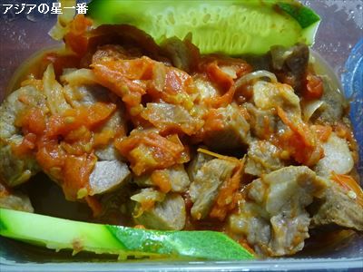 焼肉を貰いました。 「誰から?」 → 「それは秘密です。」写真は、貰ってから切った後の物ですが、大きなステーキです。肉野菜炒めが主体の、アジアの星一番の食生活、ステーキは焼いたことがありません。簡単だと言います。玉葱を切って、肉に乗せて、寝かせます。そして、トマトを切って一緒に焼くだけだ、とのこと。そんな簡単に美味しいステーキが焼けるのでしょうか?ならば、今度、焼いて見るかなー? 美味しかったですよ。肉を柔らかくする方法として、ワインに浸けておく方法が一般的だと言われているようですが、ワイン自体は「臭み取り」に特化していて、柔らかくする作用は、「たまねぎ」、「ヨーグルト」、「キウイ」を使うのが良いらしいですね。私が調べた限りでは、摩り下ろした玉葱にサラダ油を加えて肉を入れ冷蔵庫で一晩寝かす方法が良いそうです。そうすると、玉ねぎに含まれるタンパク質分解酵素が肉を軟らかくし、サラダ油が肉に旨みをつける、と言う事だそうです。一度、試して見るかなー?