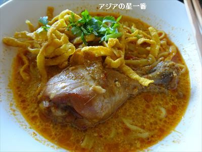チェンマイのレストランは、新しいお店が出来ては消え、出来ては消えと、変遷が目まぐるしいですが、安くて美味しいお店は、長く営業しています。カオソーイのお店もその一つであります。道路名は分かりませんが、チェンマイロッジの近くにあります。テニスを終えて、時たま、食べに行きますが、昼食時ですと、満席で待たねばならない事が多いです。これが、カオソーイです。大きなチキンのモモが入っています。柔らかく煮てあって、美味しいのです。卵麺の替玉も要望すれば、残った汁に入れて食べられます。アジアの星一番は、腹が出っ張って来て、ダイエットしなければならないのですが、欠食児童から大人になった故、食物に貪欲です。従いまして、替え玉も食べました。替玉15バーツを含めて、55バーツ=190円位です。腹一杯ですなー。腹回りが、どうかな? 2cmは増えたか? ダイエット失敗であります。さて、このカオソーイですが、タイの食べ物とばかり思っておりましたが、乏しい脳の片隅に、どっかで食べたような・・・? と言う記憶があるのです。「う~ん、どこじゃろーのー?」、「思い出せん?」これが、昨夜でした。そして、今朝、突然、思い出しました。ルアンパパーンです。ラオスです。そこで、食べたのですよ! それって、ほんとに、カオソーイ? と疑問が湧きます。何せ、乏しい脳ですから、記憶が正しいか、どうか、あやふやです。それで、日記をめくって見ました。正しいです。カオソーイを食べています。ルアンパバーンの托鉢に遭遇上をクリックすると、ブログが出ますが、そこの一番下に、写真がありました。その写真がこれです。カオソーイですねー!ちょっと調べて見ると、このカオソーイは、元々ミャンマーから来たようです。ミャンマーから、ラオス北部に伝わり、その後、ラオス北部から、タイ北部へ広がったと言うのですね。ですから、ルアンパパーンで、食べても不思議でないのです。その時は、毎朝、カオソーイを食べていましたな。ラオスのカオソーイには、ココナッツミルクは入っていないし、作り方は違うようです。長い期間を経て伝わったので、その土地に合わせたり、工夫したりしながら、広まったのでしょうね。タイ北部と言うますから、バンコク辺りや、パタヤとかには、カオソーイはないのでしょうか? 何度も行きましたが、食べた記憶がありません。