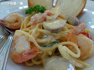 ダンスの後の昼食は、イタリアンへ行く事が多いです。前は、ボロネーゼ、その前は、ホワイトソース、そして、ここはタイ。で、この日は、トムヤムクンパスタです。これなんです。確かに、トムヤムの味ですねー。最初は、辛い、と感じましたが、食べている内に、そんなに辛くなくなり、程よい味になりました。今のところ、アジアの星一番の好きな順番は、 1. ボロネーゼ 2. トムヤムクン 3. ホワイトソースの順であります。さて、次はは、何のパスタでしょうか?お姉さんたちの会話は続きます。日本へ帰国するお姉さまもいますので、飲物も、頼んで、さらに、お話は続きます。美味しいレストランの話しや、料理の話し、旅行の話など、話題は尽きません。勿論、ダンスの話しもしますよ。帰国するお姉さまに、山形屋の焼海苔を頂きました。別のお姉さまには、パンを頂きました。いつもいつも、頂いてばかりですねー! 貧乏旅人・アジアの星一番は。ダンスは、2月末で、今期は終了しました。シーズンスティヤーの皆様が、続々と帰国しまして、メンバーが減ってしまうのが理由です。3ヶ月教えて頂きました。ダンスの腕前(脚前?)は上達していませんが、楽しい時間を過ごさせて頂きました。O先生ありがとうございました。そして受講者の皆様、優しくして頂きまして、感謝しております。ありがとうございました。又、来シーズン、よろしく、お願い致します。