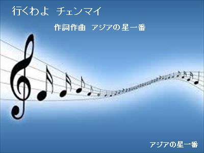700年記念公園へ、チャリを飛ばして、テニスに向かう途中、急に、メロディが、湧いて来ました。ワンフレーズだけですが・・・。「おいでよ チェンマイ」は、昨年の日本一周中、滋賀高原を走っている時、突如、メロディーが湧いて来て作りました。それに引き続き、「行くわよ チェンマイ」、であります。元画像は、yahooより借用湧いてきたメロディを、忘れないよう、チャリを漕ぎながら、繰り返しくちずさんで走ったのです。ワンフレーズだけですが・・・。しかし、テニスが終わったら、すっかり、全てを、忘れていました。全く、思い出せません。 認知症になったのでしょうか?昼食中、その話をしたら、M奥様が、「その内、思いだすわよ。」、と言ってくれました。ですけど、そんなにうまい事、思い出せないよなー?とガッカリしていたのであります。それが、10日ほど経ったある日、又、突如、思い出したのです。全く、不思議な脳の仕組みであります。今度は、忘れないよう、すぐさま、録音しました。そして、そのワンフレーズを元に、唄らしく作って行きました。まだ、メロディも完全ではありませんし、コードも付けていません。でも、歌詞は、1番だけ、出来ました。1番の最後は、「行かない チェンマイ」です。2番の最後は、「行くかな? チェンマイ」、にして、3番の最後で、「行くわ チェンマイ」、にしたいと思っています。どなたか、2番、3番の、歌詞を考えて下さいませ。「行くわよ チェンマイ」 <1番>3年前に別れた あなたから メールが届いた 今更なんなのよ3年連絡もなく ふざけんじゃないわ 虫が良すぎるわ 会いたいなんてわたしは、そんな言葉に、騙されないわ♪会いたいなんて 言わないで ダメダメよ♪行かない♪ あなたの 住んでるチェンマイへ行かない♪ あなたの、愛するチェンマイへ<2番>未完行くかな♪ あなたの 住んでるチェンマイへ行くかな♪ あなたの 愛するチェンマイへ<3番>未完行くわ♪ あなたの 住んでるチェンマイへ行くわ♪ あなたの 愛するチェンマイへ因みに、「おいでよ チェンマイ♪」の、歌詞を1番だけ掲載します。「おいでよ」 → 「行くわよ」 と続くのですが、内容的には続いていませんね。「おいでよ」、は、男性から男性の呼びかけのようですが、「行くわよ」、は、女性から男性への返事ですから。「おいでよ チェンマイ♪」おいでよ チェンマイへ 微笑が待つ おいでよ チェンマイへ 愛の街あなたが のぞむもの なんでも かなえられる街酔いたければ ナイトバザールへ 夢見るならば ピン川超えてわかくて きれいな チェンマイガール あなたの 夢みのる チェンマイの夜チェンマイ チェンマイは 愛が育つ街♪ チェンマイ チェンマイは 夢が実る町♪ 注: 最終2行は、きらりさん、作詞です。