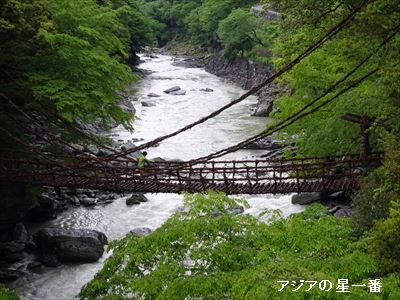 2016年5月11日(水) 日本一周139日目本日は、かずら橋を、見るだけで、美術館も、観光も、郷土料理もな~んにもありません。ですから、ゆったりゆったり、であります。暇なので、溜まった洗濯物をコインランドリーで洗おうと思います。さて、これが、かずら橋です。行き方が分かり難いのです。まず橋がありました。え~? これが、かずら橋? 普通の橋じゃ~ん? と思いますわな。これは、いやけいおおはし、と言う普通の橋であります。これが、かずら橋だったら、かなり無理して来たのに、怒りますぞ!普通の橋を渡って、右へ曲がると、料金所があります。550円です。JAFの会員だと、60円引きの、500円です。500円支払って、かずら橋のたもとに来ました。こんなに隙間があるので、高所恐怖症のアジアの星一番、渡れるかどうか、恐々と、足を踏み出したのであります。ほら、この人も、恐る恐る、そーーーっと、渡っていますよ。しかし、どう言う事か、全く怖くありません。 どうしてでしょう?かずら、と言う漢字は、蔓、と書きます。つる草を言います。つる草の橋と言えば、今年の2月、タイ北部のカレン族の村で世界遺産登録とか、冗談で言っていた橋があります。これです。竹をつる草で縛ってあります。規模も小さいし、高さもないですが、この橋の方がずっと怖かったですよ。真ん中辺りが壊れれそうだし、手摺も持ったら、折れそうですもの。敬子さんも、恐々と、渡っています。そう言えば、敬子さん、がっつり働いて、旅のお金を貯めているかなー?カレン族の、つる草橋に比べれば、がっしりして、頑丈なかずら橋です。難なく渡り切りました。やはり手摺がしっかりしているので、怖くないのですね、「祖谷の蔓橋」、と言うます。(看板の通り)国指定の、重要有形民俗文化財であります。そんなのが国から指定されるのですね。ここは、昨夜、泊まった、「道の駅:にしいや」です。今まで泊まった道の駅では、一番小さいですね。車は、10台も泊まれません。おまけに、坂道なので、車も斜めになります。寝ていても、転げてしまいますよ。ここへ来るのにナビの言う通り、祖谷渓を通って来たのですが、いやー、苦労しました。道が細いのですよ。すれ違い出来ない、細い道が延々と10数キロも続きます。もう薄暗くなった頃で、途中から真っ暗。おまけに雨と風が強くて、前も見難い。対向車が来たら、どうすりゃー良いんじゃ? とほんと、のろのろ運転で走りました。道の駅にようやく辿り着いても、誰~、もいない寂しい道の駅です。しかし、天の助け、WiFiがあったのですよ!WiFiと、バッテリーさえあれば、アジアの星一番は、満足です。充実した夜を過ごしました。かずら橋へ来るには、同じ、32号線ですが、大歩危、小歩危を通って来た方が良いですね。こちらは良い道で、2車線ありますから。ここは、大歩危峡で、きれいですよ。もう一度、かずら橋です。かずら橋と思しき、石碑もありました。走行距離 145Km使用金額 3,397円美術館 なし観光 かずら橋 大歩危峡郷土料理 なし