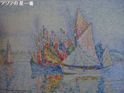2016年5月17日(火) 日本一周145日目本日は、福岡市だけです。福岡市は、芸術の造詣が深いと思われます。歌手や俳優も沢山出ていますよね。例えば、井上陽水例えば、海援隊例えば、氷川きよし、小柳ルミ子、松田聖子、長淵剛、酒井法子、徳永英明などと言う事で、美術館も多くあり、どこへ行ったら良いか迷います。まずは、福岡県立美術館へ行きました。印象派の画家の絵が多く展示されていると聞きましたので。確か、島根県立美術館で見て、シニャックの絵が気に入りました。特に点描法と言う技法で描いた絵が好きです。彼は、印象派ではありませんが、その画法を引き継いでいると言う事であります。ここには、点描法で描かれた、フィンチ、クロス、レイセルベルヘの絵もありました。シニャックの「コンカルノーの港」モネ、「ヴィトゥイユを見下ろす」今度、ブータンへ行くので、ブーダンの絵葉書も買いました。(単なる駄洒落です。)ブーダン、「ケオール、漁場の女たち」ブーダンは、空の王者、と言われ、空を多く描いた画家です。ちょっと映りが悪いですが、小さい写真を撮ったので・・・。マティス、「コルシカ島、古い風車」セザンヌ、「プロヴァンス西部の風景」、セザンヌの故郷ですね。1点だけ、マネの絵もありました。スペインだったと思いますが、マネ美術館へ行きました。どんな絵か忘れてしまいましたが。マネ、「アスパラガス」ゴーギャン、「ブルターニュの少年」ドニ、「ピンクの教会」、ドニの絵は、印象派ではありませんね。その後の画家でしょう。沢山の作品がありましたが、パンフと絵葉書からは、この程度です。入場料は、1,400円と高かったです。絵葉書も買ったし、散財でした。ですが、好きな絵もあったので、良かったです。しかし、児島善二郎と独立美術協会、の展示は、今週のみ特別週間で入場無料でした。児島善二郎、「蓮池」これは、作者は忘れました。印象的な絵でした。日本人画家です。じっくりと、良い絵を見てから、櫛田神社へ来ました。博多の総鎮守との事で、博多の商売人は、皆さん初詣にはここへお参りするそうです。山笠です。これは、高さが13.5mほどあり、これで、博多の町を練り歩くと、電線などにぶつかるので、無理だそうです。実際は、この半分以下の山笠を使用していると聞きました。これを、担いで、5キロを30分で廻ると言いますから、物凄い早さです。(ボランティアガイドさんの言)町のど真ん中の神社ですから、何かが佇んでいる、と言った雰囲気はありませんが、燈籠もあります。ガイドさんから、ここに来たら、櫛田のやきもち、を食べて行きなさいと、言われました。たった、120円なので、言われた通りに買いました。あんこが甘くて、しかし、しつっこくなくて、美味しかったです。次に、福岡アジア美術館へ行こうとしましたが、近くの駐車場が見付かりません。それで、何が展示されているかも、分からないし諦めました。そして、九州産業大学美術館へ来ました。静かで、綺麗な、キャンパスです。学生さんが写生していました。九州産業大学の美術コレクション50年の歩み、と題して展示されています。何と、入場料は無料です。SECTUON1は、「福岡美術の土壌」坂本繁二郎、「放牧」田崎廣助。「浅間山の初夏」SECTION2は、「九州産業大学芸術部の創設」で、創設に関わった方々の作品がありました。SECTION3は、「芸術部で教えた画家・彫刻家たち」、の作品でした。SECTION4は、「デザイン教育と椅子のコレクション」で、椅子を多く集めているようです。これは、背が高い椅子ですね。座高の高い人用でしょうか?(嘘つけ)SECTION5は、「西日本における写真教育」SECTION5は、九州と伝統工芸」人間国宝の方の有田焼の作品もありました。昼食は、福岡の郷土料理でも、奮発しようと考えました。学生さん数人に聞いても、誰も何が郷土料理か分かりません。それで、学食にしました、安いですからね。味噌豚肉炒めです。ライスもつけて、450円です。うまかったし、ボリュームもありました。もう一つ、絵画のおまけ、ゴッホです。「アルルのはね橋」走行距離 88Km使用金額 5,226円美術館 福岡県立美術館 九州産業大学美術館 福岡アジア美術館 → 行かず。観光 櫛田神社郷土料理 櫛田のやきもち