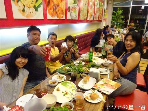 タイ語初級クラス、無欠席完璧完了記念会食が行われました。アジアの星一番は、脳に少しばかり、スカが入り、記憶力は、乏しいですが、真面目が取柄、約束したことは、忘れない限り守ります。然るに、出席率は、100%、5週間、15回、完全出席です。真面目ですなー! 凄いですなー!と言う訳で、アジアの星一番の、ご学友を紹介いたします。奥の3名の方が、クラスメートです。Hご夫妻、N嬢の3名です。他の3人の方は、Hご夫妻の友人です。場所は、チェンマイ大学の、正門の道路を挟んで反対側です。正門側から見ると、左手に見えます。赤っぽい、屋根? 庇? が見えますので、分かりやすいです。お店の名前ですが、「ベトナミーズ・フード・レストラン」と、書いてありますので、これが、店名でしょう。これは、ネーム・ヌアンと言う料理でしょうか?ピン側沿いの、ベトナム料理店の、名前が、ネーム・ヌアンで、そこで、名物と言われる、ネーム・ヌアンを食べました。それと、同じでしょうねー。ですが、ここは、ライスペーパーが、パリパリしています。お水? スープ? に付けて、柔くして食べます。そこが、ネーム・ムアン店と違います。あそこは、生でした。野菜を包んで食べるのは、ネーム・ムアン店と同じです。これは、何と言う料理かなー?全て、頼んで頂きましたので、名前は分かりません。7名で、2皿ずつ、頼んで貰いましたが、これは、1皿。少し、食べさせて貰いましたが、中には、肉とか入っていました。皆さん、楽しい方々で、色んな話が出ました。アジアの星一番には、訪ねた世界101ヶ国の内、どこが良かったか、と聞かれました。色々とお薦めしたい国はあるのですが、変わった国、特徴のある国としてイエメンとブータンと答えました。イエメンは、男性全員が、刀を刺しているのです。全員ですよ。ブータンは、全員が民族衣装を着ています。そこが、特徴でしょうか?話したい話題では、アジアの星一番の好きな砂漠があります。ヨルダンの、砂漠、ワディーラムも捨てがたいし、エジプトの、黒砂漠、白砂漠も、捨てがたいし、ナミビアの、ナミブ砂漠も、捨てがたいし、サウジアラビアの、土爆も捨てがたいし、ドバイや、アブダビの砂漠だって、捨てがたいし、中国のタクラマカン砂漠も良かったし、一番は、モロッコの、サハラ砂漠でしたなー。そんな説明しても、飲んでいるし、聞きたくないでしょうから、イエメンとブータンだけ、言いました。あと、ダイビングで潜った、海の底の宇宙的に素晴らしい国も沢山あります。でも、そんな話、聞いても、面白くないですよね?ですから、イエメンとブータンだけ、言いました。さて、料理に戻りますが、これも、料理の名前は分かりません。中には、ソーセージのような物が入っています。美味しかったですよ。お店の店員さん達です。ここ、ベトナミーズは、赤を、基調としたお店なのでしょう。庇の色も赤、店員さん達のユニフォームも赤、いいじゃないですか?肉です。豚肉です。タレを付けて食べます。これも美味しい。1皿なので、少ししか食べられなかったですが、2皿頼んで欲しかったです。サンドイッチです。料理名は、何と言うのか分かりません。これで、かなり、お腹が膨れました。味もよろしいですよ。これは、主食として、頼んだらいいですね。2皿頼みましたが、1皿、2切れです。7人なので、半分ずつ切って貰い、8切れにして貰いました。皆さん、1切れ食べましたが、誰かが、2切れ食べました。さて、アジアの星一番の、タイ語の成績をお見せ致しましょう。100点満点中、96.5点です。ふ~む、これだけの点数、満更、アホでもなさそうですな。授業中の点数が、65満点のところ、64点。筆記テストが、35満点のところ、32.5点。うふふ。まだまだ、アジアの星一番の脳も、考える力、記憶する力がある所を、証明致しましたなー。因みに、先生は、たぶん、30代後半の女性でした。授業中の点数は、先生の、依怙贔屓が有ったかも知れませんな。それは、分かりませぬ。そうそう、自慢している場合ではありませぬ。ここでの、支払い、費用です。これだけ、食べて、ビール飲まない人は、たったの150バーツ。ビール飲んだ人は、220バーツ=750円位です。お値段としては、貧乏旅人・アジアの星一番に、お似合いでありまする。