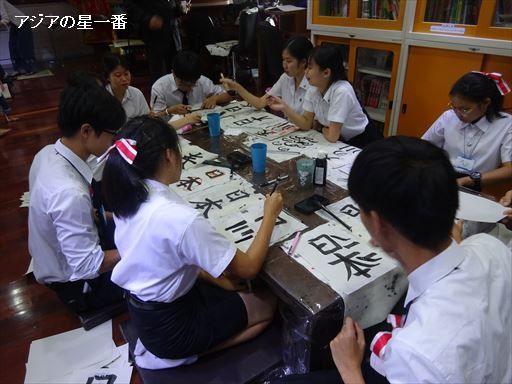 アジアの星一番が所属するチェンマイロングスティクラブの人達が、ラチャパット大学の学生に、茶道、書道、囲碁、お手玉の指導を行いました。何にでも興味のあるアジアの星一番も、見学に行って来ました。どこで指導しているのか、さっぱり分かりません。学校の受付で聞いて、日本語学部かなー、その辺りの部屋へ行きました。やっていました、書道ですな。「日本」、と書いています。ここが、ラチャパット大学の、日本語学部のある校舎の中庭です。囲碁教室もやっています。アジアの星一番も、下手くそですが、一応、打つ事は出来ます。少し見ていましたが、3級と言う女子学生さんですが、まだ活き死にが良く分かっていないようです。アジアの星一番が、5級でも、その位は分かりますから、3級は、少し甘いですね。でも、考え考え、懸命に打っていました。タイで、且つ、女性で、囲碁を打つ学生は珍しいのではないでしょうか?こちらは茶道です。チェンマイ茶道同好会と言う、会があり、その方々が指導しているとの事です。座る姿勢も良いし、指導が行き届いていますね。教える期間は、短いと聞きましたが・・・。この男性が、薄茶を点てていましたが、点て終わって、立とうとしたら、足が痺れていたのでしょう、転びそうになりました。この足の痺れ、何年やっても慣れなかったですねー。茶道を習うのを止めた理由も、その足の痺れも一つの要因でした。分かりますよ、その痺れの感覚。茶道の指導を見ていて、日本人よりも姿勢が良いし、歩き方も、手の置き場も、完璧だなー、と思った女性がいました。容姿も素敵です。お点前は見られませんでしたが、客として座ったり、お茶を飲んだり、歩いたりする姿は、とても良かったので、お点前も、たぶん、上手であると、思いました。是非、次は、彼女のお点前で、お茶を飲んで見たいものです。こう言う場所に来て、アジアの星一番が、いつも思う事ですが、ボランティアで指導する方々、素晴らしいですよね。自分の時間を割いて、指導するのですよ。準備だって大変でしょう?アジアの星一番には出来ません。人前でしゃべるのが、苦手ですし、対人恐怖症的な面もあり、女性と二人病と言う持病もあります。自分一人で、作業する時間も欲しいですしねー。にも拘わらず、何でも見たいと言う欲望もあるのですねー。まぁ、矛盾しています。とまぁ、そんな訳でありまして、ボランティアで、地域に貢献する方々には、ほんと感心し、尊敬する次第であります。