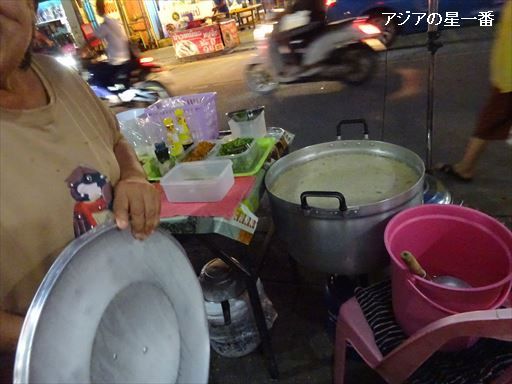 行きつけのサンティタムのお粥屋さん、休んでいたと思ったら、開いていたり、どうなっているの? と思っていました。つまみにビールを飲んだ後、もう少し食べたいのですよね。それには、お粥が最適なのです。そしたら、最近は、開いている時が多くなりました。 良かったー!サンティタムの大通りの道路端に、お店はあります。20、15、と数字が書いてあります。良く分かりませんが、大きなお椀が、15バーツ、その大きなお椀に、さらに卵を入れると、20バーツだと思います。アジアの星一番は、小さなお椀に貰います。それで卵も入れないと、10バーツ=34円なのです。もう、つまみにビールを飲んでいますから、大きなお椀は不要です。この写真は、大きなお椀です。おばあさん、一人でやっています。聞きましたら、土曜日は、休みだと言っていました。ほんとかなー? 出来るだけ、休みの日以外は、お店をお開けて欲しいものです。