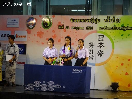 大役を仰せつかりました。な、なんと、審査員と言う役職であります。審査され続けた人生です。審査した事なんて、たぶん、ありませんなー。ラチャパット大学の、コンテストなのです。え? 美人コンテストの審査か? ですと? 惜しいですなー。女子大生は、女子大生なのです。この審査員、お断りしたかったのですよ。水着審査ならば、オタオタしながらも、審査出来たと思うのですが・・・。水着ならば、ずっと、近寄り、すぐ傍で、その、ほら、あれを、あの辺りを、じっくり審査出来ましたよねー、なんせ、審査員ですからなー。しかし、美女コンテストではないのです。じゃー、何だ? 実は、お弁当コンテストと言う、アジアの星一番には、審査の仕方も分からぬ、コンテストの審査員なのです。緊張しましたなー。前々日から、眠りが浅かったです。たった、8時間位しか眠れなかったですぞ。(え? 眠り過ぎ?)会場へ着いたのは、40分ほど前です。折り紙コンテストの真っ最中でした。しかし、何の説明もありませぬ。どこで待てとかもありませぬ。会場で、うろうろしておりましたな。ほとんど、開始時間になった時、審査員席に座れと言われました。どうやって、審査するんじゃ? と、おどおどしておりました。席に着くと、採点表があります。見ると、12校の高校生が、弁当を作るようです。その採点をするのです。名前を呼ばれて、審査員の紹介があり、早速、学生たちは、弁当を作り始めました。料理時間は、20分間です。採点表には、5項目の審査項目がありました。 ①見た目、 ②食べられるか? ③栄養は? ④テーマに合っているか? ⑤プレゼンと、、まぁ、こんな項目であったと思います。①から③は、学生さんたちが、作っている時に、じろじろと見ながら、採点しました。しかしながら、12校あるはずの参加者が、全部いないのです。そんなの教えて欲しいですよね? 何番が欠席とか。学生さん達の、付けている番号を確認しながら、採点しましたが。確か、7番と、11番が、不在でした。エントリーしたけど、参加出来なかったのでしょうね。20分経過して、出来上がりました。仲々、素晴らしい出来栄えではないですか?これが、出来上がった時点で、3項目の採点は完了しました。あとは、プレゼンと、そのテーマに料理が合っているかどうかのみ、採点すれば良いのです。プレゼンは、日本語ですし、高校生ですから、皆さん、しどろもどろでしたなー。話すことを忘れていしまって、立ち往生って子もいました。数組は、しっかり説明していましたが、その学生さんたちの料理は、やはり上位に入る完成品でした。やはり、説明できるほど、準備をしたのでしょうね。アジアの星一番は、自信を持って、採点しましたぞ。審査員は、3名で行いましたが、審査員同士の、打合せはありません。採点したものを、担当が持ち帰りましたので、たぶん、採点を合算したのだと思います。成績発表まで、時間があります。次の出し物、踊りなどを見ました。会場には、こんな、AKBのようなコスプレの子もいましたぞ。弁当審査を行いましたが、試食は一切なしです。12時頃からの審査なので、腹減りました。MAYAと言う、大きなショッピングセンターで行われたので、フードコートに出かけて、豚肉面を食べて来ましたぞ。一番安い、35バーツ=120円弱の麺です。さて、成績発表です。審査員の自分でも、誰が優勝したか分かりません。だって、審査後の打合せもないのですから。優勝は、これです。アジアの星一番が、96点と言う、高得点を付けた組が優勝しました。第2位は、アジアの星一番が、93点を付けた、この組です。第3位は、秋をテーマにした、この組です。説明もなく、どうやって審査すりゃーいいんじゃ? と、おどおど、おたおたしながら審査を行いましたが、結果的には、アジアの星一番が、上位に点数を付けた、3組が、優勝、2位、3位でした。アジアの星一番も、弁当を見る目があるのでしょうか?審査を終えて、気楽になって、カラオケコンテストを聞き、そして、踊りなども見て、会場を後にしました。あぁ~、疲れたなー!