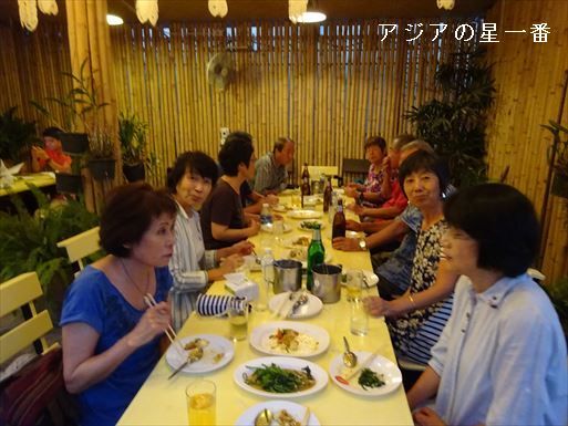 高級中華レストランにやって来ました。とある事で知り合いになった、チェンマイ友に、誘って頂きました。こんな綺麗なお姉さんが、笑顔で迎えてくれます。JIA TONG HENG RESTAURANT、と言います。漢字では、「謝東興」、と書きます。え? その発音、正しいの? と疑問に思った、あなた、仲々、中国語通ですなー。標準語では、こんな風に読みませんものね。標準語ならば、XIE DONG XING、となるはずです。実は、このレストラン、潮州料理なのです。従いまして、広東語か、潮州語なのですねー。 ちょいと、潮州料理って奴を調べてみますと、==============================中国広東省潮州市や汕頭市を中心に食べられている中華料理の中の地方料理。タイ、シンガポール、香港などでも一般的である。 潮州は、ずっと広東省に属しているが、言葉は東隣の福建省南部で話される閩南語の一種である潮州語という方言が使われている。この事からも分かるように、もともと民族的、文化的には福建省南部と一体となっている地域であり、食文化も例外ではない。 ==============================と、上記の通りなのです。レストラン内は、ちと、高級そうな雰囲気をしております。いつも、アジアの星一番が行く、食堂的なお店とは、違いますぞ。テーブルに着くと、もうこんな物が置いてありました。付け出しでしょうか? 何かの、タレでしょうか?食べて見たら、そんなに辛くもなく、つまみに良いですね。そして、チャーンビールを頼んで、驚きました。な、なんと、大瓶1本が、120バーツ=410円なのです。先日、催物広場の中華屋さんでは、最安値の、60バーツでした。ここは、その2倍します。高いですねー。さすが、高級風レストランです。そして料理です。メニューを見ると、全てが良いお値段です。それで、6人が、一皿ずつ選んで注文しようと言う事になりました。小皿と、大皿があり、それぞれ、お値段は、大皿が2倍します。それで、6人だし、小皿を注文する事にしました。一皿目は、これです。誰が頼んだのかなー?二皿目は、オイスターです。アジアの星一番がこれを選ぶかどうか迷ったものですが、別の皿にしたのでした。むーさんが注文しました。美味しかったですよ。仲間の5人です。向かって右から、Hご夫妻、その次が、むーご夫妻、そして、独身のなおさんです。なおさん、寝てんのか? 写りが悪いぞ!これは、アジアの星一番が選んだ、豚肉です。味は良かったですが、骨付きで、食べる部分が少なかったです。この夜の、話題は何と言っても、アジアの星一番よりも、貧乏・節約家がこのチェンマイにいるって事でした。むーご夫妻、1ヶ月、二人で、10万円で生活しているって言うのです。そうすると、一人5万円也、アジアの星一番の、7.6万円を大幅に下回っています。貧乏を売りにしているアジアの星一番の、下を行く人がいたのです。驚きましたなー! まさか、そんな人が居るとは・・・。CLLの皆さんの前では、7.6万円での生活は無理だ! と、散々、言われました。しかしながら、これで、アジアの星一番の言っている事が、嘘でなく、本当に安く生活できる事が実証されたのであります。アジアの星一番が、ゴルフを止めると、丁度1ヶ月、5万円となります。むーご夫妻と同じになるのです。彼らは、ゴルフしませんから、実際は、アジアの星一番と同等の生活をしているって事になります。さらに、なおさんです。独身で一人で生活しています。1ヶ月、2万バーツなんて使っていないと言います。すると、やはり、5万円位で、生活しているのですねー。いやはや、心強いですなー!同じような方々が、チェンマイで生活して、生きているのです。嬉しくなりましたぞ。なおさんが、頼んだ、オードブルのようなものです。他の皿は、一皿、120バーツでしたが、これだけ、200バーツでした。4切れのものが、3種類ありました。これを6人で食べます。困りますよねー? どうやって食べたら良いか?そしたら、なおさん、一人、2種類食べましょう! って言いました。頭いいですなー! 2種類×6人で、12切れで丁度なんです。ほんと、算数が出来ますねー!Hご夫妻は、我々、貧乏・節約家の仲間ではありませぬ。岩登りが趣味らしく、クラビに行ったり、ハノイに行ったり、あちこちに出かけています。それで、生活レベルは、結構、高いと推定されるのであります。FXとか、株とかで、儲けているのでしょうね。これは、豆腐料理です。そして、皆さんが、これを食べに来たかったと言う、焼きそばです。何でも、チェンマイで一番美味しいと言う評判らしいですぞ。まぁ、でも、味は普通でしたね。ここの、お味は、中華にしては、薄味の部類に入ります。この焼きそばも、薄味でした。アジアの星一番には、丁度良いのですが、普通の方には、もっと濃い味が好きだと思われます。炒飯も頼みました。この、お店ですが、スーパーハイウェイ沿いにあり、メージョーへ行く道路の脇に、テープパンヤー病院がありますが、その隣です。謝東興