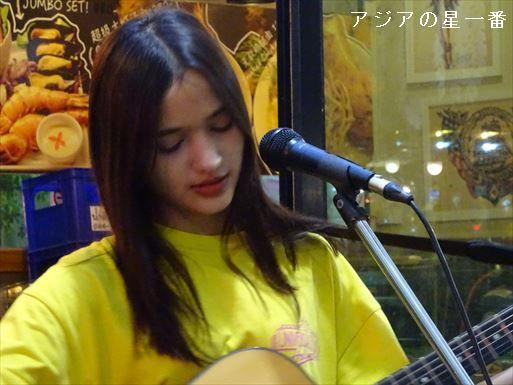 如何ですか? 可愛くって、美しい女性でしょう?ここは、ターペー門を潜って、旧市街へ入り、道路を渡り、ちょっと歩いた道路の右手にある、カフェにいます。食事は後述しますが、早く食べ終わったので、コーヒーでも飲もうと立ち入ったカフェなのです。トイレに行こうと、そちらへ歩いて行くと、美しい歌声か聞こえて来ました。ギター抱えて歌っているのが、この娘さんなのです。仲々、綺麗な娘さんでしたぞ。ブログには、出来るだけ美しく、皆さんが、ホッとするような写真を載せたいと常に希望しております。それで、出来るだけ、カメラを持ち歩いているのであります。本日は、今の所、大成功ですな。わたくし、アジアの星一番は、彼女と同じ年ごろ(たぶん)、コンサートなどに出演していたものですから、こう言う人と出会うと、懐かしいと言うか、凄く親しみを覚えますな。チップを上げたくなります。ですが、残念ながら、貧乏旅人、思っただけで、あげていません。ダメですねー! 如何にもケチです。少しでも、あげれば、日本人の価値が上がるのですけどねー。いかん、いかん、日本人の価値を下げているぞ。アメリカンを頼みました。腹が一杯で飲むコーヒーも美味しいですな。ターペー門近くの、サンデーマーケットの道路に面したカフェですが、とても、静かで、良い雰囲気でした。中国人の方々、中華正月も終わる頃なので、帰国したのでしょうか?実は、この日、予てより、魚屋へ行きたいとおっしゃる、ゴルフ仲間の方と、ターペー門の外側の広場で待ち合わせしました。綺麗な花が、置いてありましたぞ。さすが、信頼のおける、日本人、待ち合わせ時間の、17時半、ちょっと前に、来られました。以前、待ち合わせ時間に来ない、日本人の若者がいて、ちと腹立った事がありますが、この日はそんな事はありませぬ。すぐに、魚屋へ行きます。17時半と、食事には少し早い時間なので、座席は確保出来ました。野菜炒めを頼みました。この味、好評なのですよ。ラージの魚を2匹、頼みましたぞ。4人ですから、2名で1匹です。4人で1匹は、少ないですよね。豚肉です。これも好評なのですよ。柔らかくて美味しいのです。ジンソムモックです。このお店のお薦めなのですが、美味しいと言う声がありません。ちょっと酸っぱい味の、豚肉ソーセージなのですが・・・。皆さん、スポーツ好きだったり、趣味も沢山持っておられるので、色んな話題が出ました。Nさんは、ゴルフも上手だし、ソフトボールも選手だし、詩吟もプロ並みのようですぞ。Aさんは、東南アジア各国、各都市に住み、ダイビングもするし、いつも明るく朗らかで、話題も豊富です。ゴルフ場で知り合った方々ですが、良い人達と巡り合いました。始めに頼んだ料理は食べました。もう少し、食べたいので、カオニャオと、それから、卵焼きを頼みました。ソーセージも頼みました。早く行ったので、食事も早く終了しました。待っている人達がいるので、あんまりゆっくりおしゃべりも出来ません。19時にお店を出て、そして、カフェでゆっくりしたのであります。でも、カフェも20時で閉店でした。チャリを取りに、魚屋に戻って見ますと、お店の前は、行列でした。人気のあるお店でしょうー!チャリを飛ばして、サンティタムの宿に向かいます。車やバイクが走っているので、夜は、昼より、ちょいと危ない気もします。でも、安全運転に心がければ、大丈夫ですね。相手が、ぶっつけてきたら、避けようがないですが・・・。