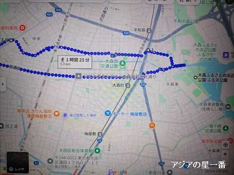 2025年07月22(火)今朝は初めて行きますが、「大森ふるさとの浜辺公園」へ行く事にしました。1時間20分ほどかかる見込みです。旭通りを東へ進みます。スーパーの跡地に建てられるヘーベルハウスですが、基礎のみで進んでいませんね。京浜東北線や東海道本線の線路を渡ります。酒処 豊作がありました。我がおじいさんの名前と同じなので、一度行こうと思いつつ行けてません。結構高そうなのです。メイン道路、旭通りからお店らしいのが見えないので、通り越してしまう時もあります。東邦医大通りを渡って直進します。京浜本線の下を潜って直進します。ここは国道15号、第一京浜です。ここも越えて行きます。隣には、国道131号が走っています。細い道を歩きます。看板がありました。内川の辺は、サクラのプロムナードなんですね。桜の咲く頃、来て見なければならないですね。これが、内川です。この辺を海に向かって歩きます。東京湾の入り口までやって来ました。広い河口です。もうこの辺りが、大森ふるさとの浜辺公園でしょう。どこがメイン広場なのか分かりません。大田区との姉妹都市、アメリカのセーラム市と言う市のようです。中国北京市朝陽区とは、友好都市なんですね。夾竹桃通りがありました。垣根が全て夾竹桃です。第一京浜に戻って来ました。来た道を引き返すのは面白くないので、1本北側の道を歩きたいとこの道を選んでいます。あ、そうそう、昨日から使えなくなった、マップのナビ、今朝は治っています。昨日、諸々調べて対策を取ったのですが、治らなかったのです。しかしながら、今朝、治っていました。いやー、良かったです。諏訪神社がありました。マップを使いましたが、結局、新しい道は歩けず、内川に出てしまいました。ここは、先日歩きました。来る時に渡った線路です。旭通りですね。山崎パンまで戻りました。ここは池上通りです。アパートまで1分かかりません。本日は、多少、道に迷ったりした事もあり。1時間40分もかかりました。10,500歩も歩きましたぞ。シャワーを浴びて、朝食のトマトジュースです。桃もあります。お腹が膨れますね。10時のコーヒーです。つまみは、草餅です。もう2個残っています。野村証券にやって来ました。担当の女性が退職し、担当が変わったので、是非、挨拶したいので、打ち合わせを持ちたいとの事でやって来ました。しかし、ドル預金しているお金を、年金にしないか? と言う事でした。13年間で、毎年10%の利子が付くと言う年金です。ふ~む、困りましたな。毎年、預金は減って行くので、いずれ解約します。年金に替えて毎月貰っても同じなんですよね。同じ野村証券に預かって貰うのですが、別口をお薦めするって、野村証券にしては、何が得になるのでしょう?2時間近く説得されて、時間がかかりました。考えます、と言って帰って来ました。もう午後1時です。腹減りましたよ。蘭州拉麺を食べようと来ましたが、暫くお休みします、と言う貼り紙がありました。残念。それで、同じ麺の、なか卯にやって来ました。結構客は入っています。きつねうどんの大盛にしました。560円です。さすが老舗のなか卯、美味しいですねー。麺もキツネもスープもとっても美味しいです。帰りに楽天モバイルによりました。スマホで電話する時、電話番号が非通知になり、相手先が受信拒否をしてしまうのです。池上総合病院も、非通知だと受信拒否で、予約も出来ないで困っています。それで設定を変えて貰おうとやって来ました。前回来た時は、いい加減な担当者で、意味不明な説明で何もやってくれませんでした。しかしながら、本日の担当は一生懸命調べてくれましたぞ。非通知設定を解除してくれました。しかし、アパートに戻って、池上総合病院に電話して見ましたが、以前と同じ、受信拒否です。又、楽天モバイルへ行き、診て貰わねばなりません。午後のコーヒーと、つまみです。まだ草餅が1個残っています。2024年のブログです。もう10月になりました。日本へ一時期帰国していたのですね。その時に、山手線ウォークを行っています。4日間で歩いていますな。菅笠を被って、金剛杖を持って歩きました。山手線ウォークは、四国お遍路を終えた後も歩きましたので、2回目でした。夕食です。3日間ビール飲みましたので、今夜は禁酒です。休肝日を設けました。ハンバーグ弁当を買って来ました。具沢山の味噌汁を作ってくれました。茄子、魚、チキン、卵焼き、キューリ、酢の物とつまみも多いです。今朝の散歩は、大森ふるさと浜辺公園でしたが、帰りは道に迷いました。次回はもう少し調べてから行きたいと思います。朝の散歩も、近場はほとんど歩きました。コースは、15コース位、あるでしょうか? もう新しいコースはなさそうです。又、繰り返し、初めから歩きましょう。