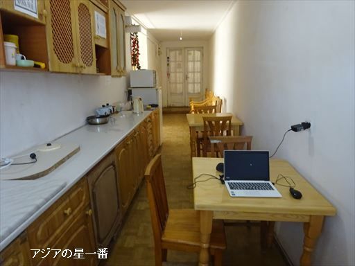 ここがキッチン兼食堂です。狭いですが、この机の隣に電源が