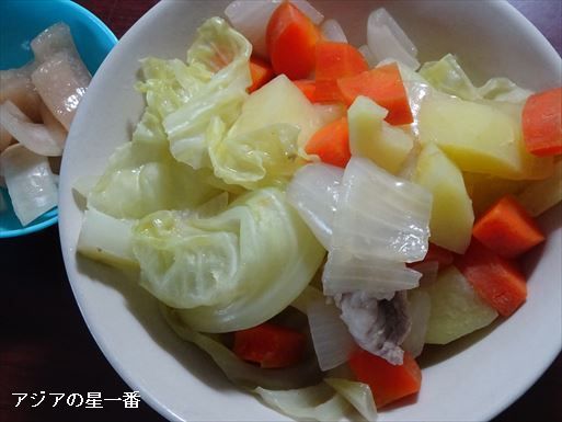 夕方、豚肉に、野菜を切って、コンソメスープで煮込みました。