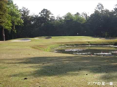 ここは14番ホールです。2打目が池越えで、2打オンはまず難しい。