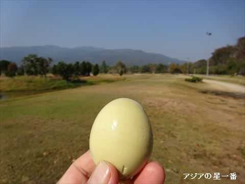ハーフ終わって、3コースにやって来ました。キャディさんがゆで卵を