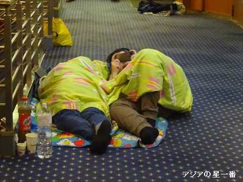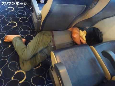 こんな所でも寝ています。座席と座席の間ですよ。