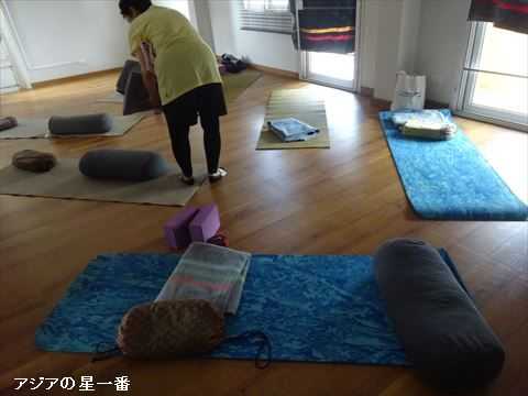 マットを敷いたり、準備作業です。1時間10分程たっぷりヨガを行いました。