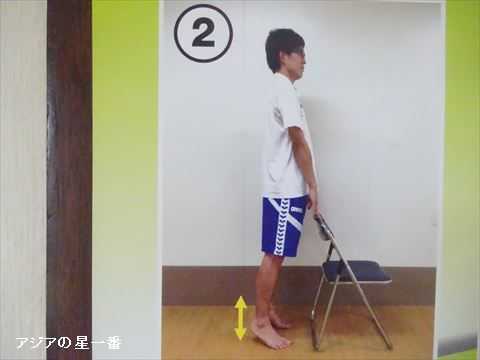 一つ目は、椅子に捕まり、踵をあげる運動です。