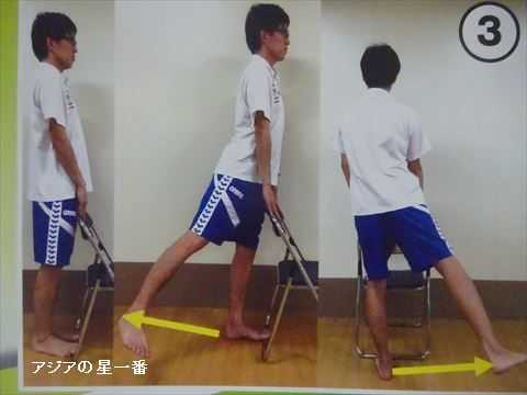 二つ目は、椅子に捕まって立ち、足を斜め後ろに上げる運動です。