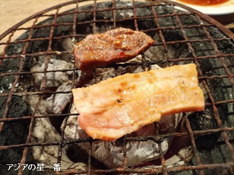 ここは炭火で自分で焼くのです。炭をテーブルの上に持って来て