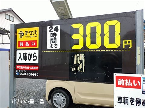 駐車場の看板です。24時間300円です。安いですねー! 東京とは