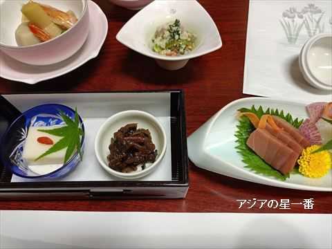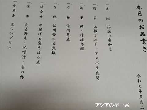 夕食です。きちんとした、お品書きがあります。8種類です。