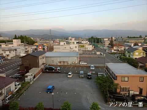 ルートイン塩尻の部屋の窓からの写真です。やっぱり山がありますね。