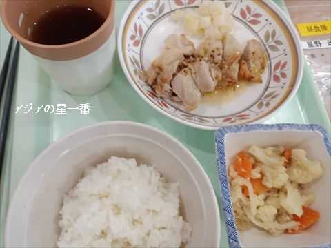 昼食は、ご飯、チキン、ブロッコリー、お茶です。