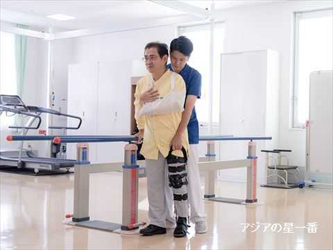 長下肢装具を付けます。そしてまずは立つ練習です。