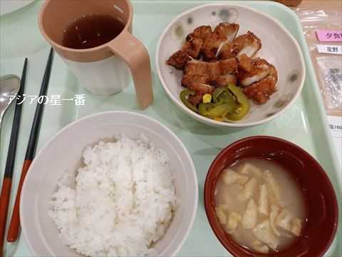 夕食です。ご飯にチキンカツ、味噌汁、お茶です。
