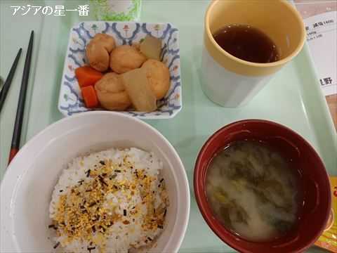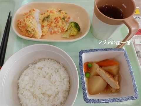 昼食です。ご飯に煮魚卵、ジャガにさつま揚げ、お茶です。