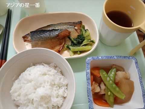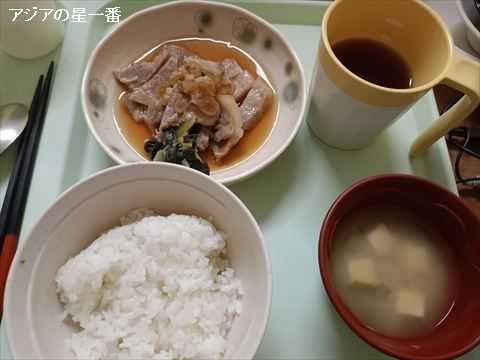 夕食です。ご飯にポーク、味噌汁にお茶です。ポークは珍しく