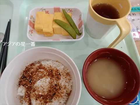 ふりかけご飯に味噌汁、玉子焼きにお茶です。